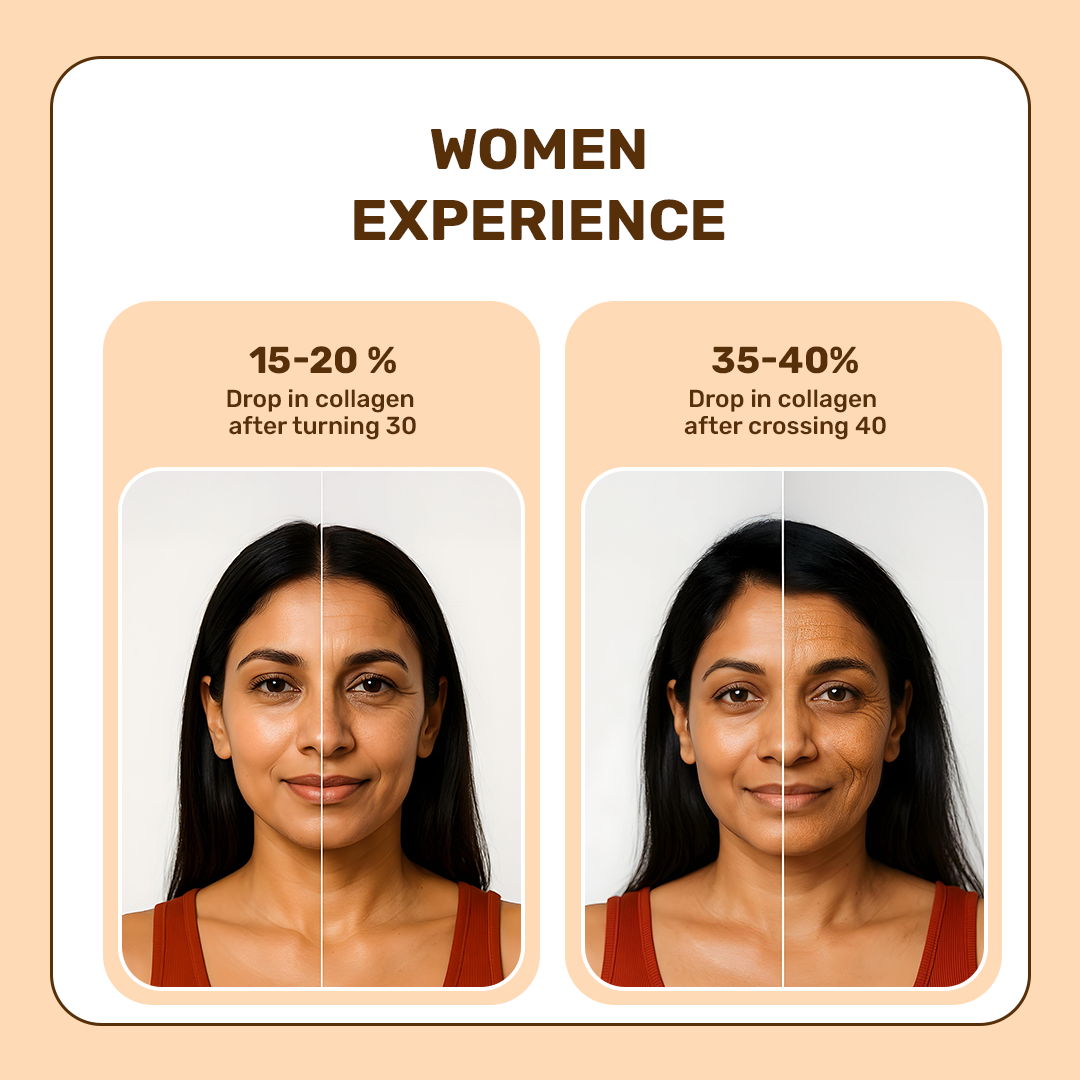Collagen production decreases from around our mid-twenties to early thirties, with our skin producing one per cent less collagen each year. As our body’s collagen production drops, skin loses elasticity and hydration, wrinkles form, and our hair and nails can become dry and brittle.